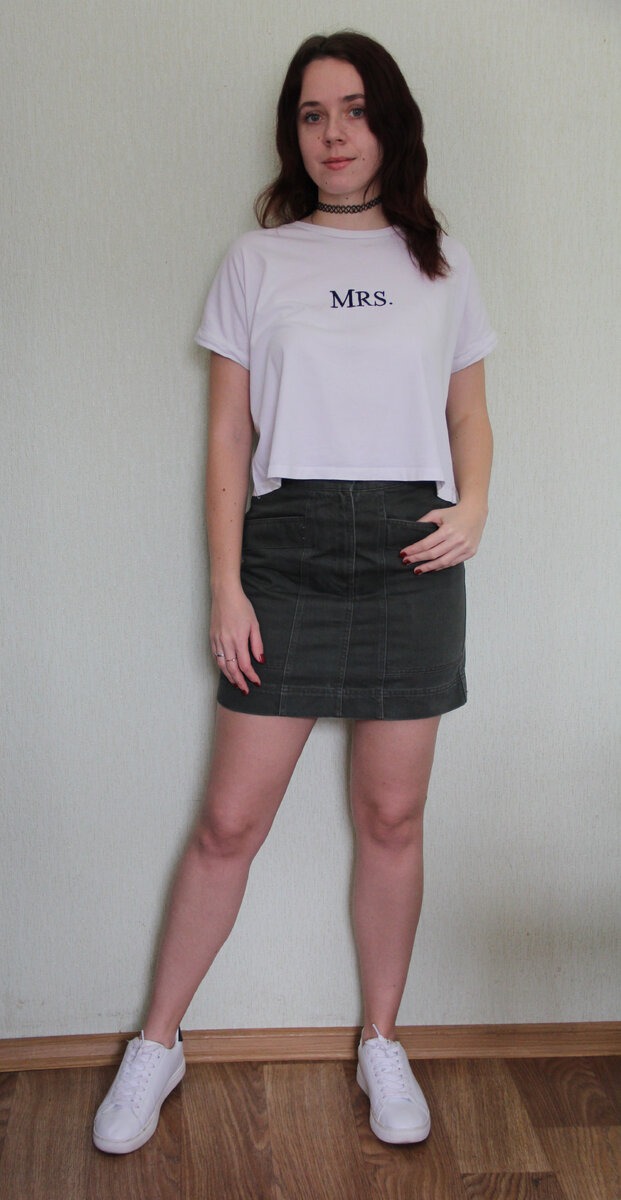Я покажу поэтапно, как добавляла одежду к этому наряду. Сначала продемонстрирую саму юбку и футболку в сочетании с кедами.