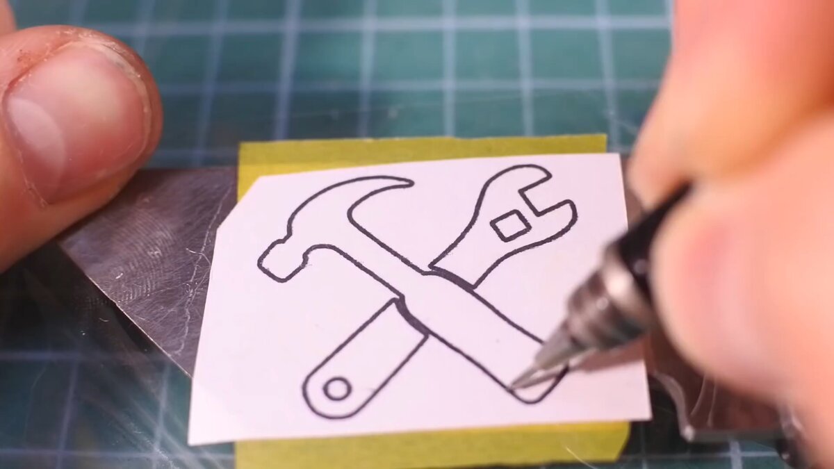 Способ травления - электрохимический, электричество в среде электролита будет выжигать металл из незащищённых участков. Первое что нужно сделать - защитить участки, которые не будут травиться. Это можно сделать лаком или краской, а сам рисунок процарапать острым инструментом. Я предлагаю самый быстрый и колхозный вариант: для начала переносим рисунок на металл при помощи копирки