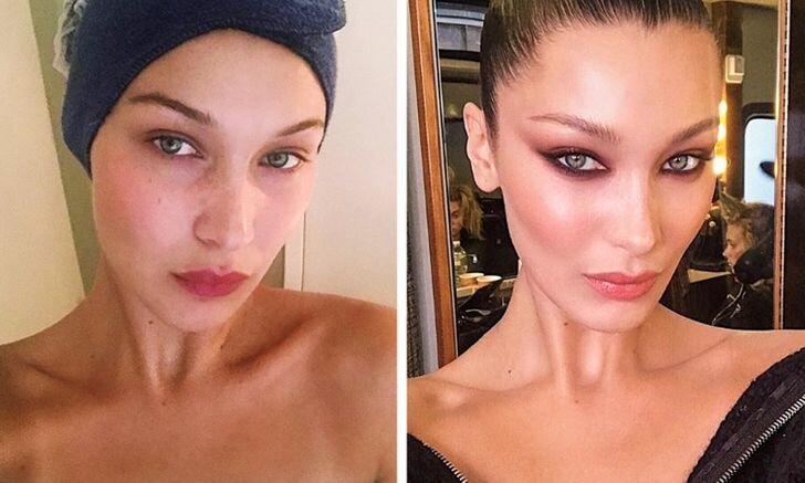 Подчеркнуть достоинства Беллы помогает дрейпинг. Смысл этой техники заключается в том, чтобы скорректировать лицо только при помощи румян и хайлайтера, без серо-коричневого корректора. Так лицо выглядит объемным и свежим. Также модель не представляет свой образ без стрелок: в зависимости от ситуации и наряда она пользуется черной или коричневой подводкой.