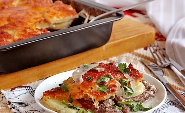 - Если все приготовилось правильно, можно без труда вырезать кусочек на пробу. Мясо получается очень сочным и мягким, картофель распадается и сырная корочка приятно радует своим вкусом.