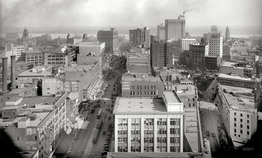 А сейчас переносимся в Детройт 1964 года. В конце октября там появилась группа МС5 (от "Motor City Five"). Вот он, город Детройт 60-х, который сегодня загнил и развалился: