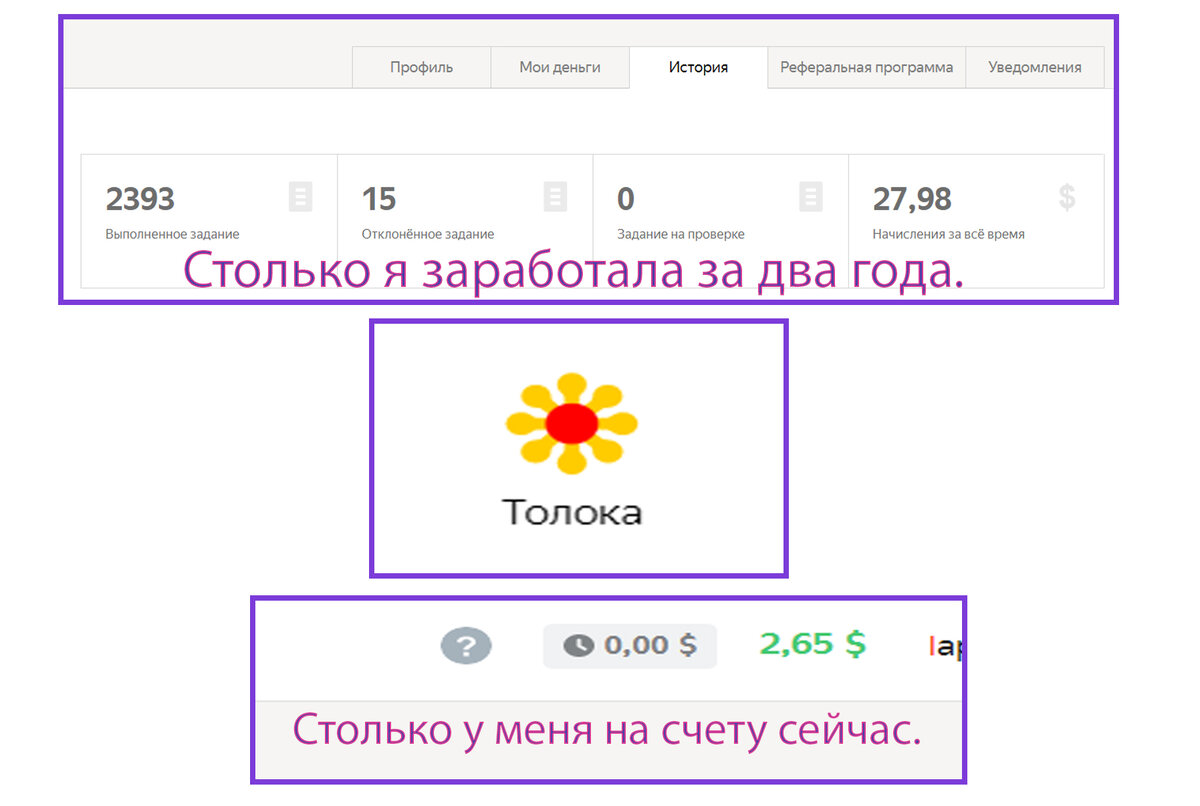 За все время работы в Толоке, я смогла заработать почти 28 долларов! Сейчас у меня висит 2 доллара 65 центов.