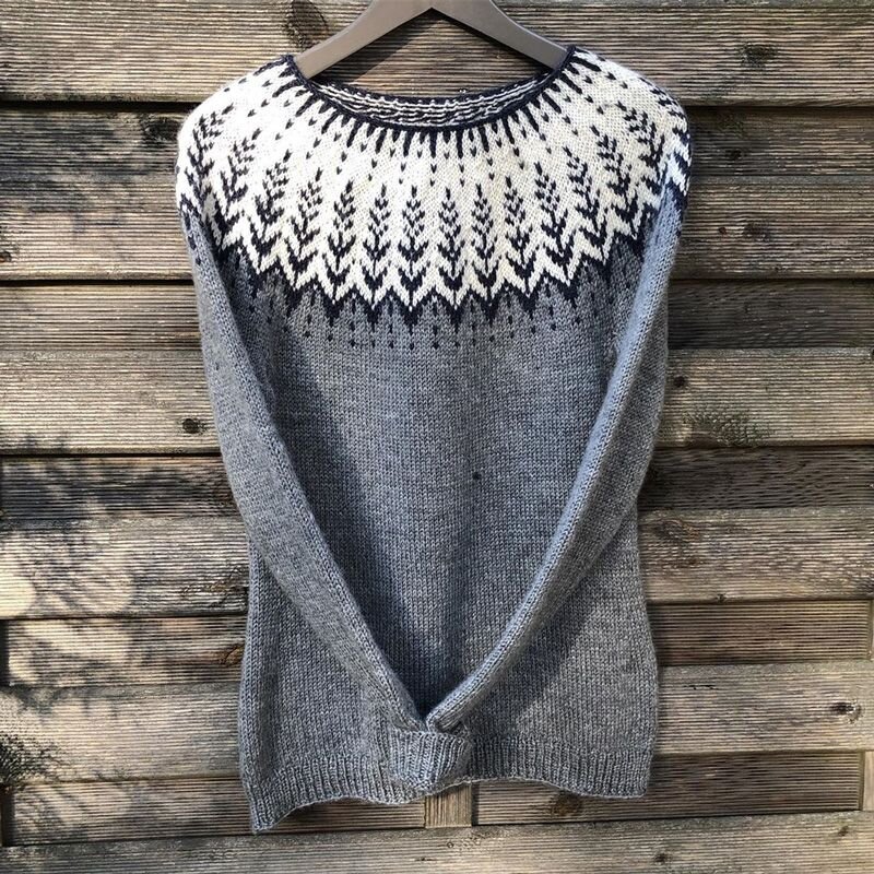 Такие изделия получаются бесшовные. Узор расходится от горловины к плечам. Низ рукавов и низ изделия оформляют фрагментом тонкой полосы орнамента. При этом основа джемпера однотонная.