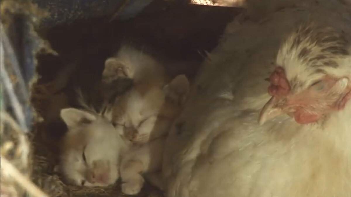 Необычная дружба животных удивила работников одной фермы, неожиданно для всех котята родившиеся совсем недавно начали убегать от кошки мамы к курице, которая с радостью и материнским теплом приняла их и занималась их воспитанием.