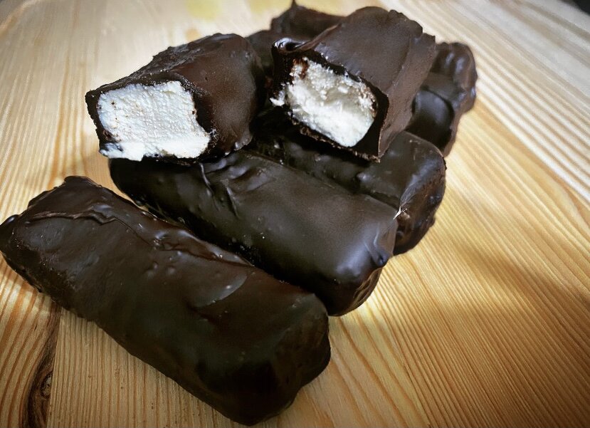 Тем временем, растапливаем шоколад на водяной бане, на медленном огне. Достаём наши заготовки, аккуратно опускаем в растопленный шоколад и вынимаем, долго в шоколаднее держите, убираем излишки ножом и выставляем на разделочную доску ( она также должна быть в пленке) и снова отправляем в морозильную камеру на 10-15 минут. После чего наши сырки в шоколадной глазури готовы! Приятного аппетита 👌🏼