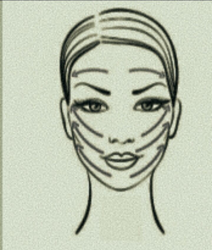 Применение лёгких поглаживающих движений в соответствие с массажными линиями , расположенными от центральной части подбородка по направлению мочкам ушей. От внутренних уголков рта к верхней части кончиков ушей и от средней части лба к вискам.