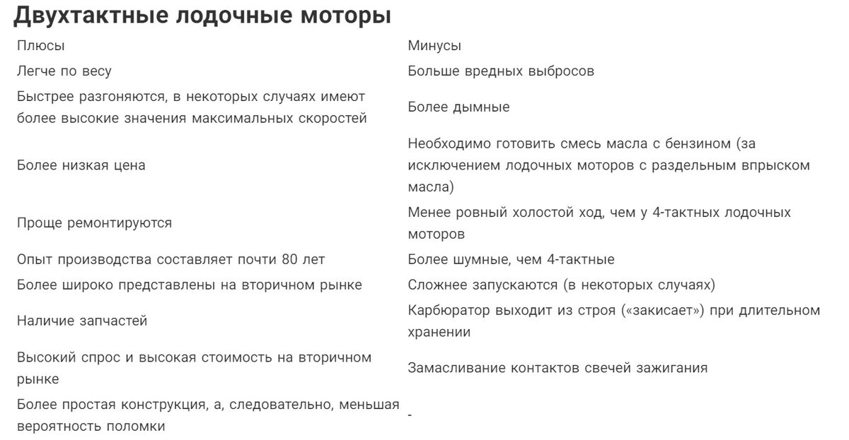 Заметим, что все вышесказанное совсем не означает, что 2-тактные лодочные моторы не годятся для троллинга, а 4-тактные моторы не достаточно быстрые. Это просто вопрос предпочтений, особенностей и преимуществ, которые привлекают каждого конкретного покупателя. Независимо от того, какой двигатель вы решили купить, если вы тщательно взвесите все «за» и «против» и не спеша все обдумаете, то не ошибетесь, а приведенная ниже таблица основных плюсов и минусов обоих типов моторов, надеемся, вам в этом поможет: