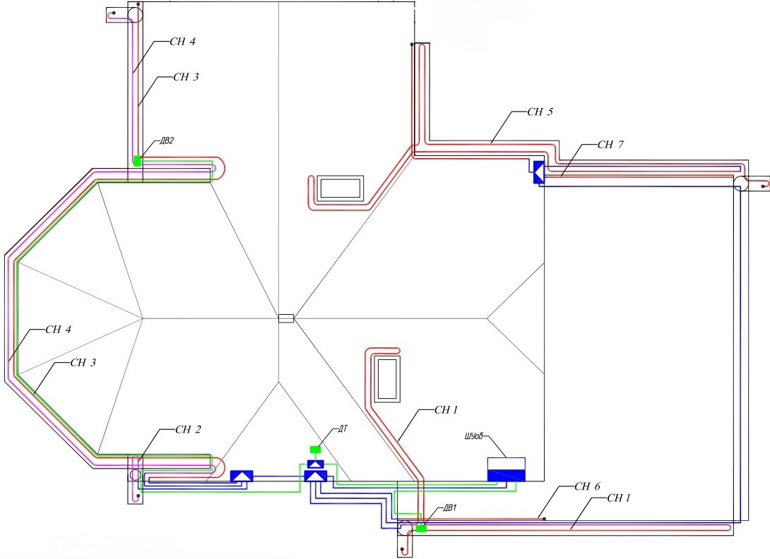 Такая система состоит из: нагревательной сетки (маты); распределительной сети (с ее помощью подключаются все маты и датчики управления); система автоматической защиты и управления (предотвращает поломки при замыканиях); система автоматического управления обогревом. Тепло в этой системе выделяет резистивный кабель. Иногда используют саморегулирующийся кабель. Он так же имеет свои положительные стороны: - экономит энергопотребление, варьируется мощность кабеля в зависимости от обледенения; - такая система очень надежна, регулируется выход тепла в зависимости от температуры на улице; - кабель можно укладывать внахлест, и при скоплении мусора, исключена возможность перегрева кабеля; - кабель легко ставится, легко обслуживается. Чтобы система антиобледенения работала хорошо, необходим термостат (система управления), который будет регулировать включение/выключение системы, в зависимости от температуры. Иногда устанавливаются элементы системы снегозадержания, чтобы система антиобледенения работала эффективно.