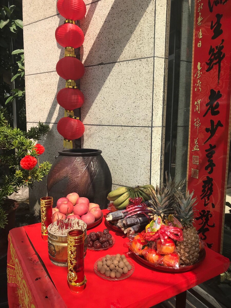 В южном Китае очень часто можно увидеть на улицах, перед входом в жилые частные дома, рестораны, кафе, парикмахерские, магазины и прочие заведения, подобные столы, часто накрытые красными скатертями с изображением богов долголетия, богатства и/или богов защитников.