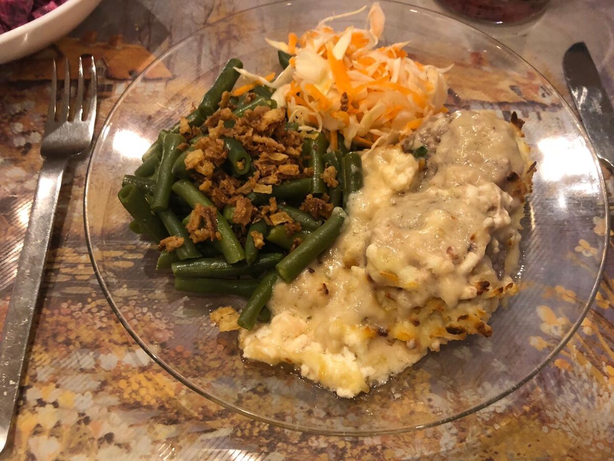 На гарнир можно приготовить, что угодно. На фотке вы видите гарнир из зеленых стручков фасоли, приготовленных на пару в мультиварке, со сливочным маслом. Сверху фасоль присыпана сухим жареным луком. Кроме того, на тарелку я положила немного салата «Витаминный», из капусты с морковкой.