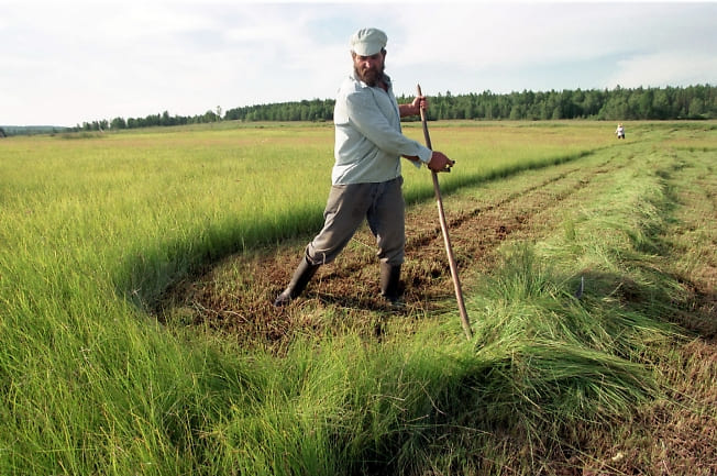 Ладно, отец там впихал себе что-то с трудом, погрузились они в телегу и поехали. Приехали в поле, отец слазит с телеги хватает косу и начинает косит.