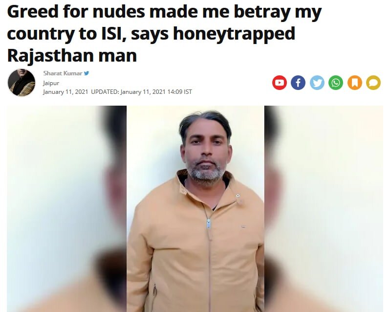 42-летний житель Индии Сатьянараян Паливал выдавал государственные тайны разведке Пакистана. Под арестом он признался, что делал это в обмен на фотографии голых женщин.
