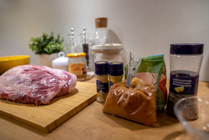 Утром, первым делом сливаем жижу в которой плавает наше мясо и натираем его второй половиной сыпучих ингридиентов. В идеале дать постоять ему еще часа 3 на столе, чтобы нагрелось до комнатной температуры... но тогда подавать его к столу получится в лучшем случае часов в 9 вечера. Так что я даю ему постоять ровно столько, сколько нужно для подготовки остальной части.