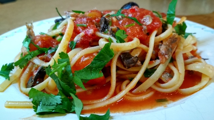 Сведующие товарищи укажут мне на рецепты пасты путанеска от Джейми Оливера с тунцом, или распространенные в интернете рецепты с консервированным анчоусом. Не буду спорить, есть и такое. Но мне не хотелось готовить из консервов.