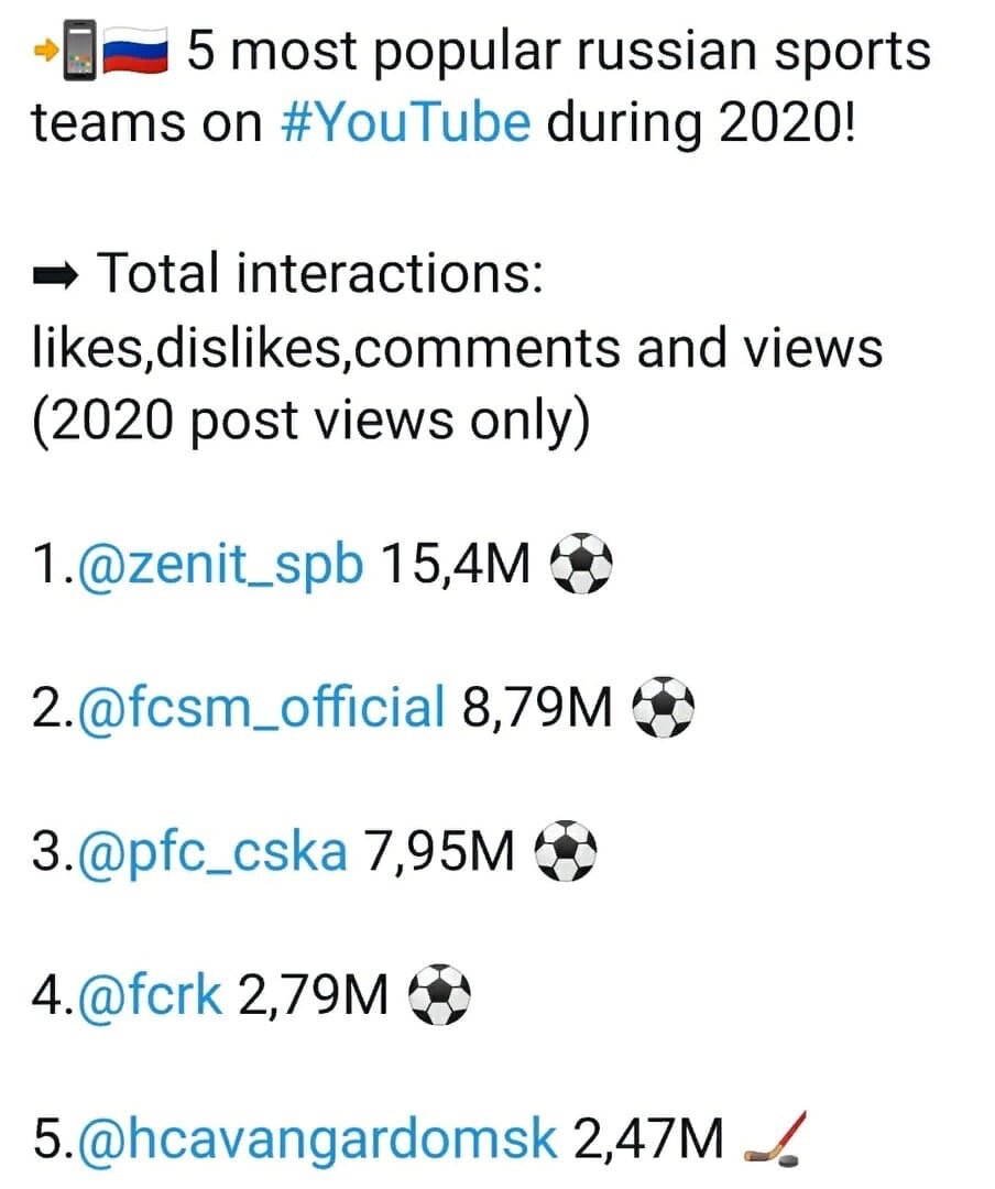 Twitter-аккаунт Deportes & Finanzas назвал "Зенит" cамым популярным российским футбольным клубом в YouTube по итогам 2020 года.