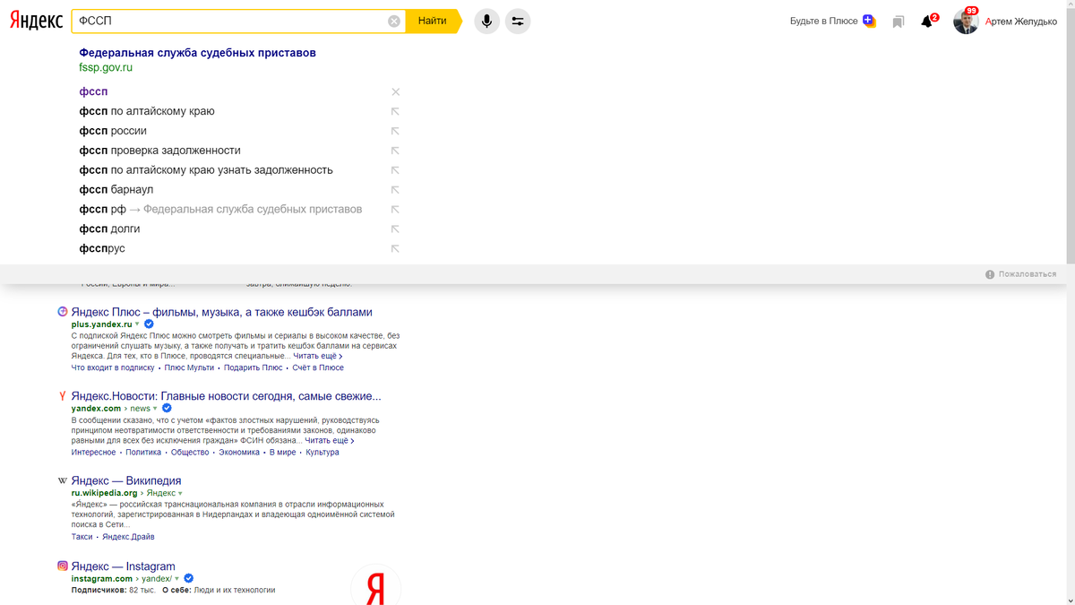 И сразу к ответу на вопрос: Очень просто, для этого нужно зайти на сайт fssp.gov.ru Чтобы зайти на этот сайт через поиск Яндекса, необходимо набрать в строке поиска «ФССП» и нажать кнопку «Найти»: Обычно сайт судебных приставов появляется самым первым в результатах поиска, и вот как раз и он: Заходим на него: Мы попали на главную страницу нужного нам сайта, здесь расположена строка «данные для поиска», сюда мы вводим полностью: фамилию, имя и отчество необходимого человека. Это можете быть не только вы, но и любой другой человек, данные на сайте абсолютно открытые. Пусть в нашем случае это будет некий «Иван Петрович Семенов». Теперь, нажимаем кнопку «найти»: Получилось, сайт показал нам все найденные результаты. Но вот беда, людей с такими фамилией, именем и отчеством достаточно много в России. Давайте введем дополнительные данные, чтобы результаты были более конкретными. Например укажем регион поиска «Омская область»: И еще раз нажмем кнопку «найти»: Теперь сайт выдал нам один резу