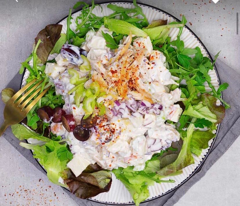 6. Смешать курицу, сельдерей, яблоки, лук, виноград с греческим йогуртом