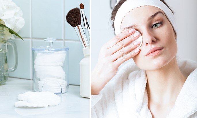 - Пропитай ватный диск мицеллярной водой и легкими движениями протри все лицо включая губы и веки. Повторяй процедуру и меняй ватные диски до тех пор, пока они не станут чистыми. Не смывай, нанеси увлажняющее средство.