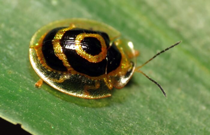 Поразительную по своей красоте живую драгоценность можно встретить в Америке: отлитая из чистого золота статуэтка или янтарная брошка на поверку оказывается… жуком. Обитает это удивительное насекомое на листьях вьюнковых растений и относится к семейству листоедов, то есть является дальним родственником известного вредителя картофельных полей — колорадского жука (Leptinotarsa decemlineata).