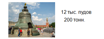 Царь колокол. Это самый большой колокол из всех существующих колоколов мира. Он не имеет себе равных и по художественному литью. Вес колокола более 12 тыс. пудов, или 200 тонн. Высота колокола 5,87 м, диаметр - 6,6 м. Царь-колокол отлит в Кремле в 1733-1735 гг. русским мастером литейного дела Иваном Моториными его сыном Михаилом.