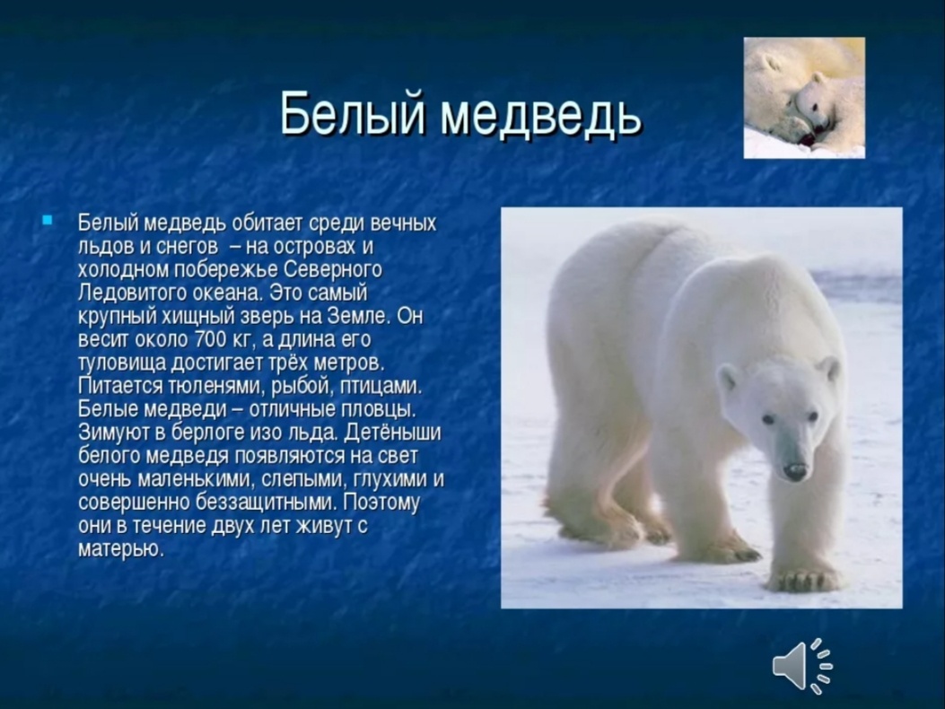 Белые медведи считаются хищными животными, при этом являются достаточно близкими родственниками бурых медведей. Это млекопитающее представляет крупнейшего сухопутного хищника, который встречается на нашей планете в пределах полярных широт.