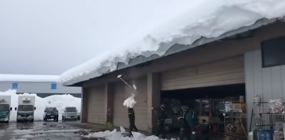 В ролике, снятом в городе Акита, группа рабочих стоит у ворот склада. Один из них пытается очистить крышу от снега, который в любой момент может обрушиться кому-то на голову. Мужчина подталкивает его длинным шестом.