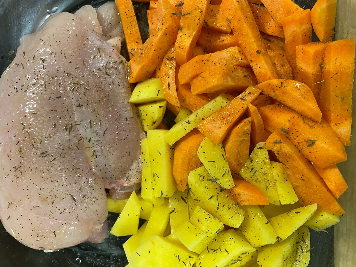 3. В жаропрочную посуду выложить куриное филе, морковь и картофель