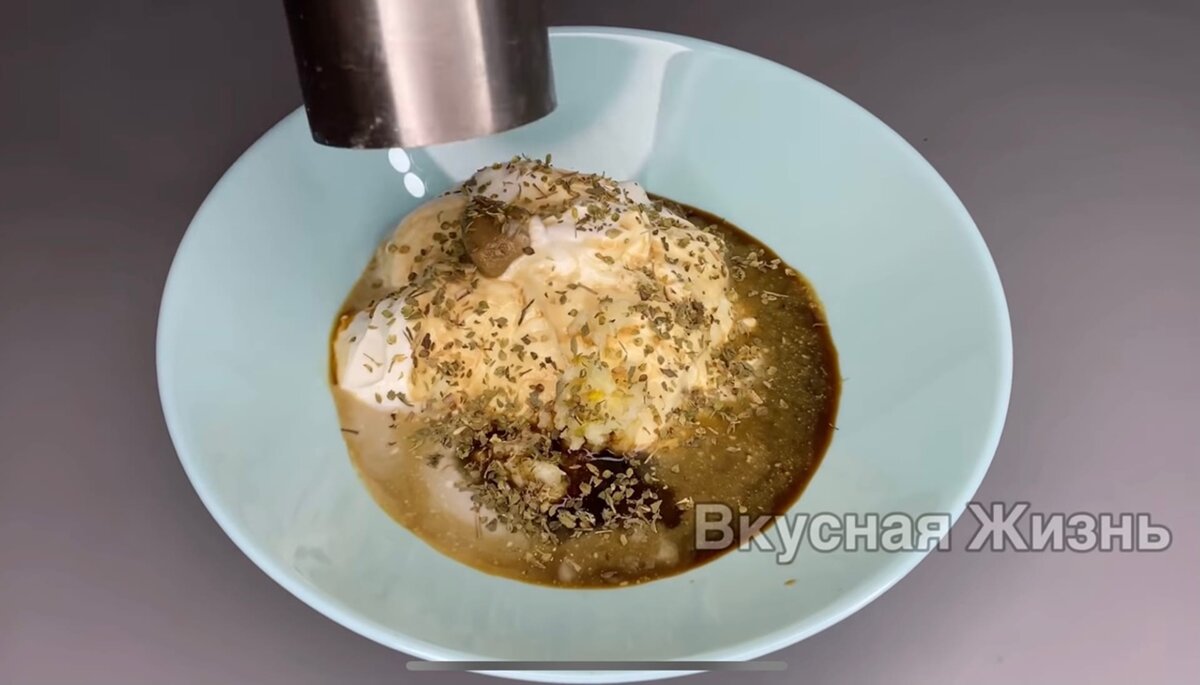 1. Весь секрет вкусной рыбки заключается в соусе. Для этого в тарелку отправляем 150 гр. сметаны, 3 ст. ложки соевого соуса, пол ч. ложки горчицы, 2 измельченных зубчика чеснока, орегано и черный перец. Тщательно перемешиваем.
