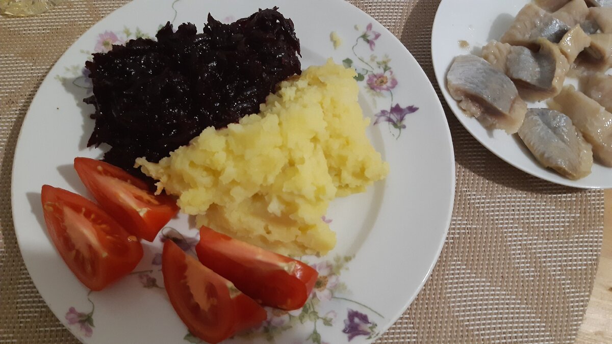 1. холодильник - практически пустой: остатки домашней кабачковой икры, гусиный жир (собрала вытопившийся с гуся жир, готовила на новый год птичку, он много куда пригодится), остатки сыра (совсем чуть-чуть), литра 1,5 скисшего молока и немного ряженки, 1 л молока (куплен сегодня), остатки творога, томатная паста, нарезанная кубиками тыква в банке, есть морковь, одна редька и немного зелени, пол-кочана капусты, немного сливок и 0,5 кг телятины. Также были вареная свекла, картофельное пюре, пара помидоров и селедка. Это все использовала на сегодняшний ужин.