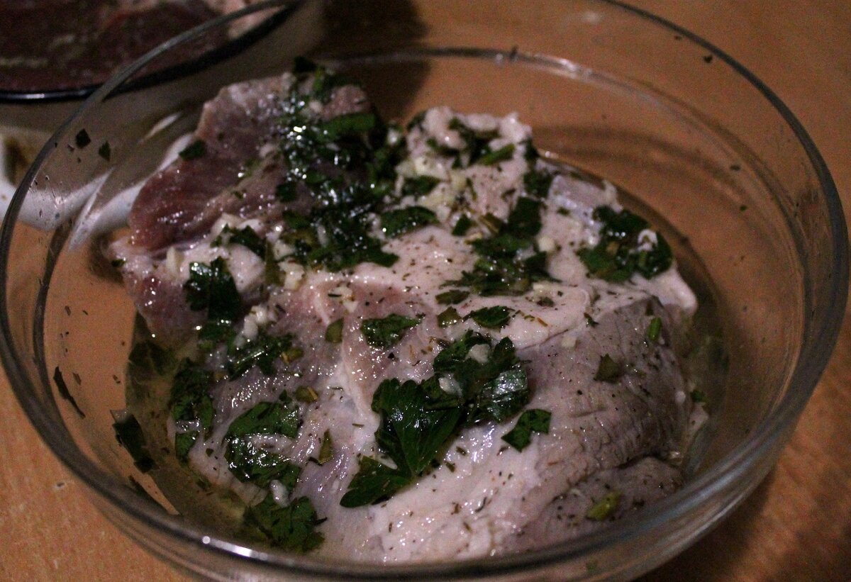 Натрите мясо солью и перцем. Смешайте остальные ингредиенты в миске, положите свинину и полейте ее. Накройте миску крышкой. Переверните и полейте мясо 3 или 4 раза в течение периода маринования.