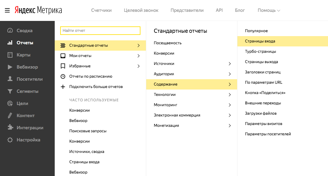 Заходим в Яндекс.Метрику: Отчеты - Стандартные отчеты - Содержимое - Страницы входа.