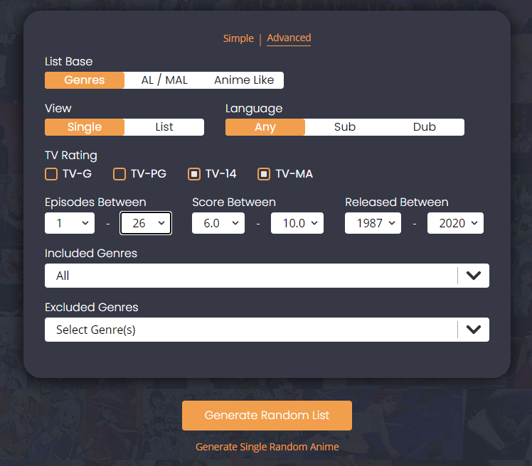 Генерируется сразу большой лист тайтлов, из которого я взял пять самых первых, чтобы всё было честно. Говоря о настройках, убрал детские аниме, те, что длиннее 26 серий (спасибо за понимание), и с оценкой выше шестёрки, чтобы не было откровенного треша.