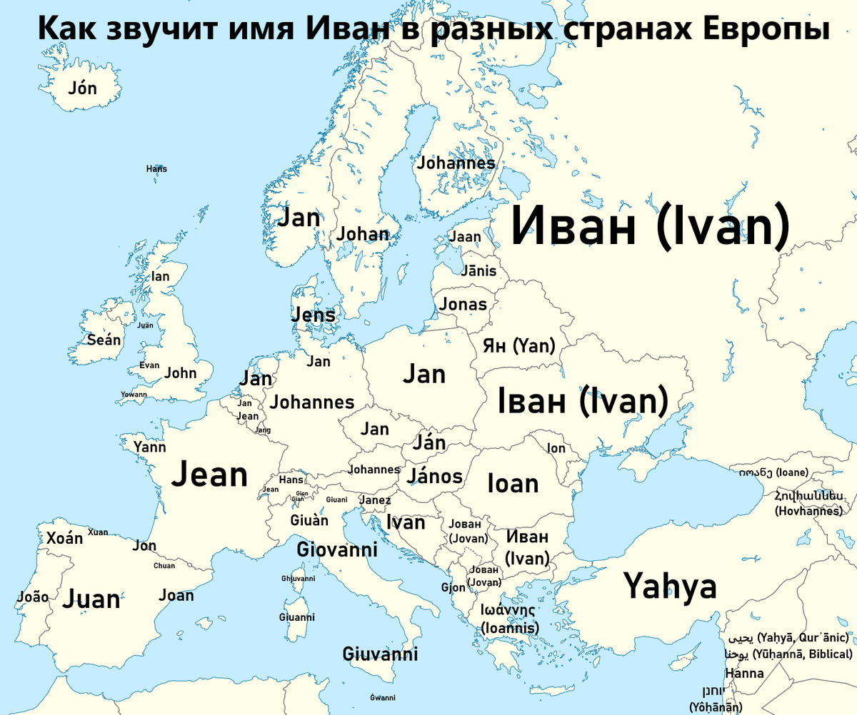 В странах западной Европы это имя звучит похоже - Хуан (Испания), Джон (Англия), Жан (Франция). Примечательно, что в Уэльсе (часть Великобритании) Evan - звучит довольно близко к русскому. И написано почти также, только, как будто, - транслитом.