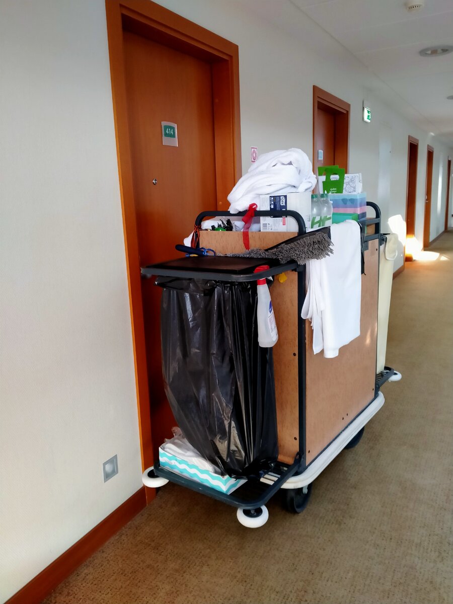 Слева на тележке висит большой пластиковый мешок. Горничная зашла в номер и вынесла из него пакеты с мусором, которые и отправились в большое чёрное жерло этого мешка.