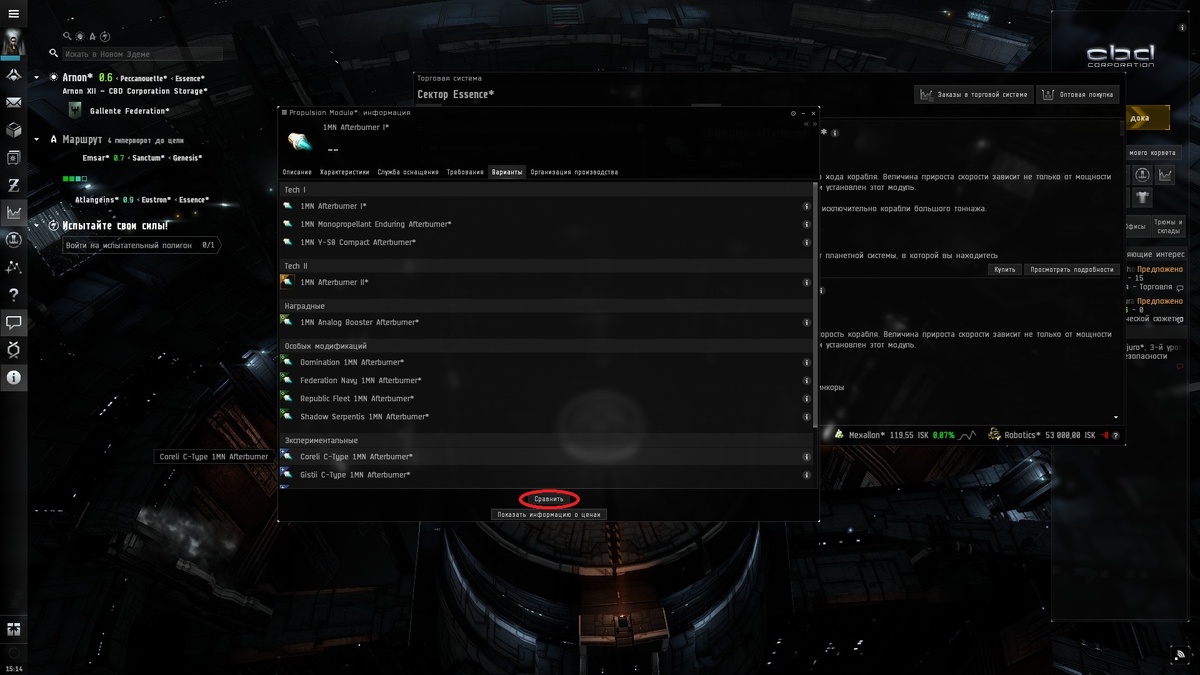 Для того, чтобы открыть окно сравнения, мы должны открыть информацию о модуле и перейти на вкладку варианты. Далее нажать на кнопку сравнить в низу окна (как показано на картинке)