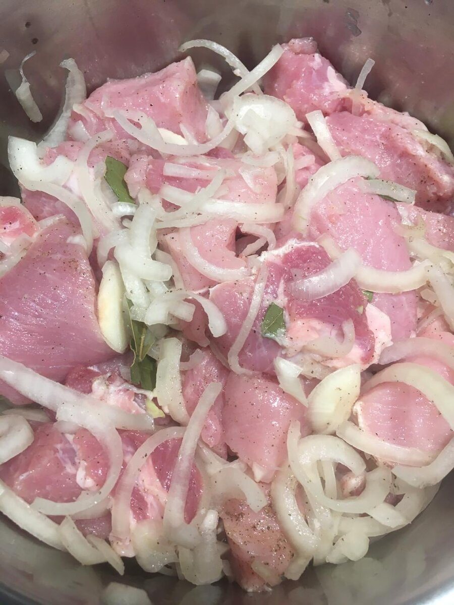 Необходимо за 3-4 часа до жарки замариновать мясо, используя репчатый лук, специи и соль.