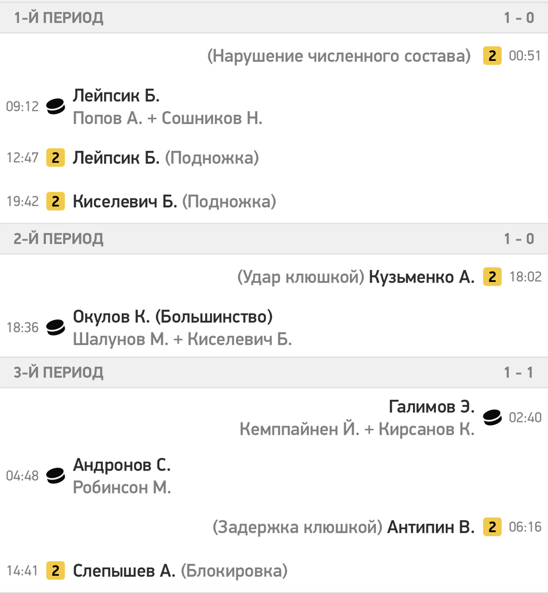 Голами у столичной команды отметились Брендэн Лайпсик (10-я минута), Константин Окулов (39) и Сергей Андронов (45). В составе проигравших шайба на счету Эмиля Галимова (43).