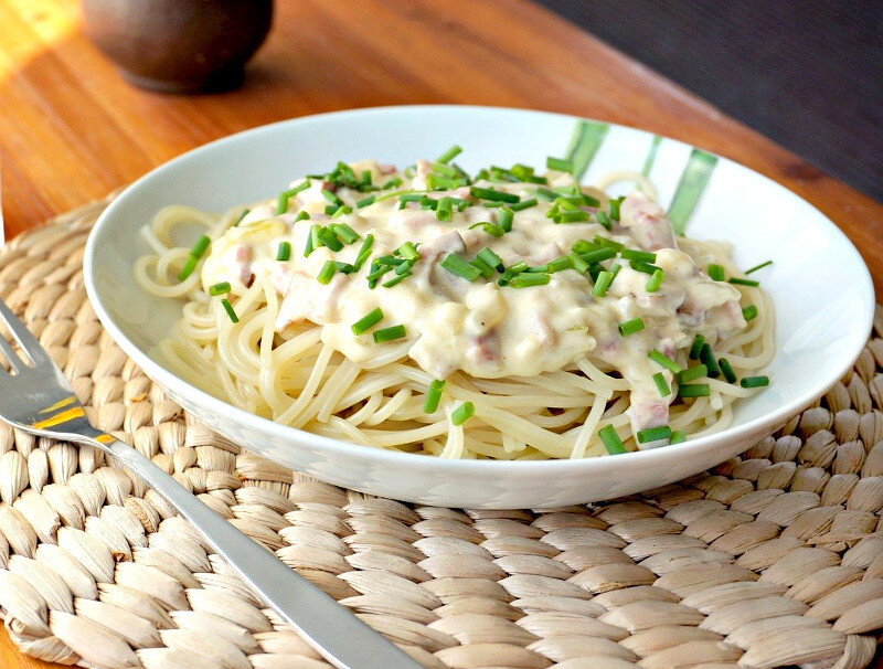 Добавьте к сливкам сырое яйцо и взбейте вилкой или венчиком до равномерности. Добавьте полстакана подогретой воды и влейте к грудинке в сковородку.