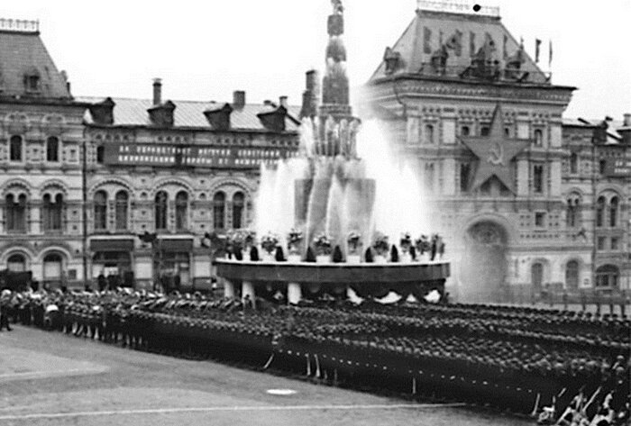 На некоторых фотографиях того парада видно сооружение, совсем не согласующееся с нынешним видом главной площади страны. Это фонтан.