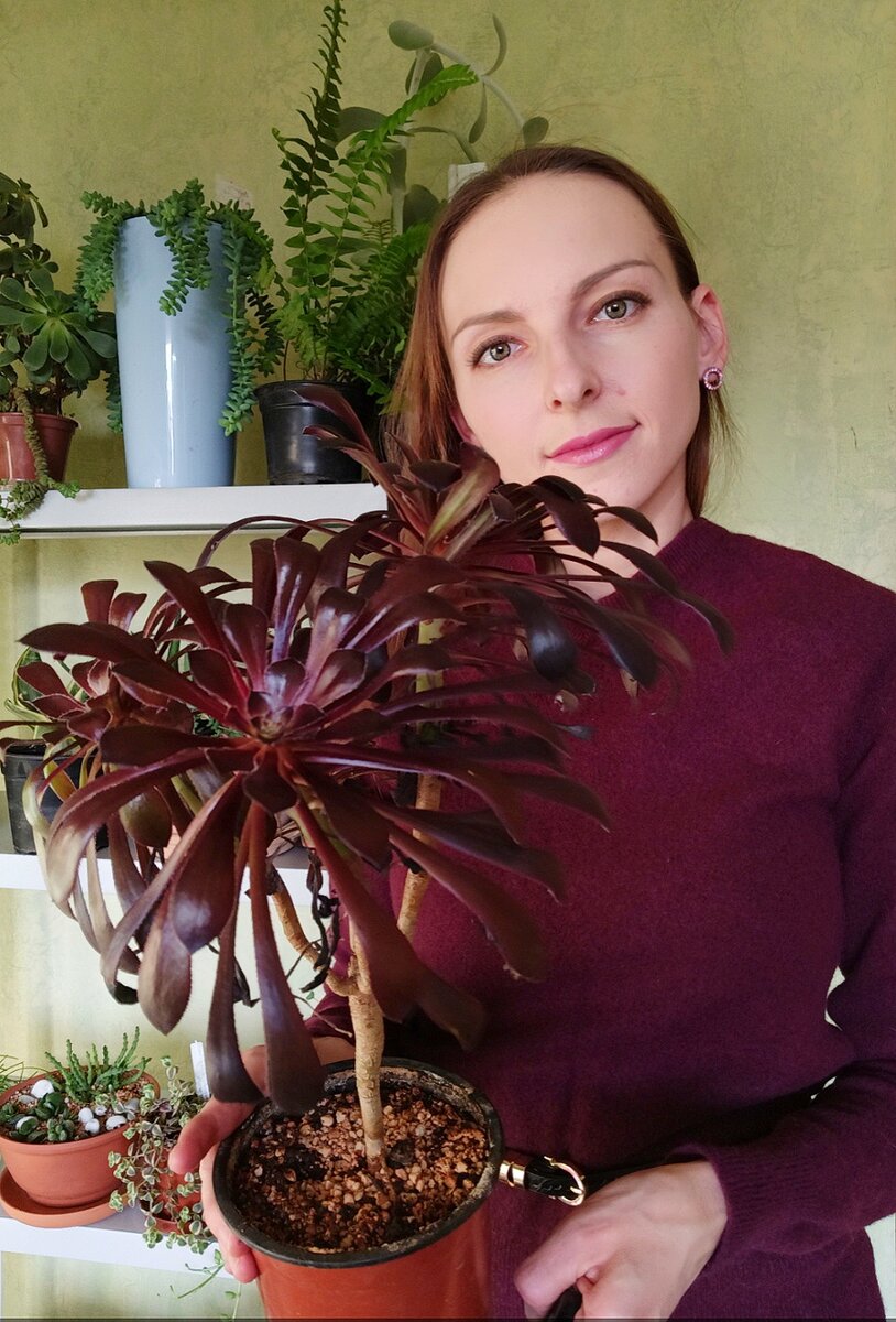 Начну обзор с эониума Шварцкопф. Это растение с листьями насыщенного бордового цвета. По форме напоминает небольшое аккуратное деревце. Неприхотливый житель, который прекрасно переносит сухой воздух наших квартир зимой. Может вырасти до метра в высоту. В природе этого красавца можно встретить в Эфиопии, Средиземноморье, на Аравийском полуострове. Кстати, другие эониумы тоже могут похвастаться яркими оттенками листьев. Вид под названием Киви - это сплошная радуга. Правда, зимой из-за недостатка света он у меня слегка потускнел.