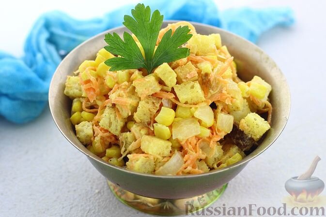 Салат с кукурузой, морковью и сухариками готовится достаточно быстро, особенно если сухарики будут сделаны заранее. Приготовить их можно в духовке или на сковороде. Благодаря обжариванию лука салат становится более сытным и приобретает невероятно аппетитный аромат.