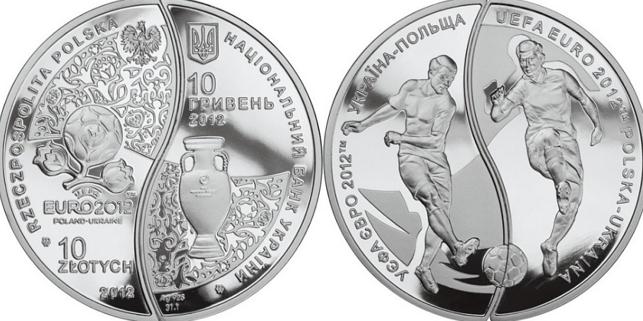 Центральным элементом композиции, украшающей аверс одной половинки монеты, является логотип Европейского Футбольного Чемпионата. В нижней части указан номинал, который составляет десять злотых, а также год выпуска монеты – 2012. Кроме этого, по краю монеты имеется надпись: «Польская республика» (на польском языке). Фоном этой половинки, как, впрочем, и второй, стал растительный орнамент.