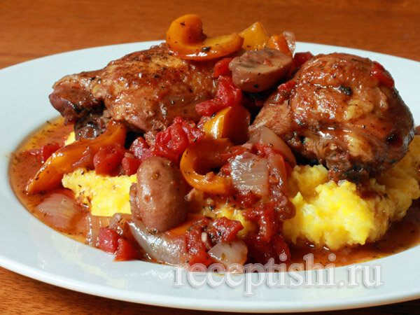 Курица по-охотничьи с помидорами и сладким перцем готовится очень просто: части курицы обжариваем в масле, затем обжариваем овощи и готовим соус, из красного или белого вина. Хорошо, если найдутся сушеные белые грибы. Это действительно восхитительное дополнение. Купленные в супермаркете свежие или замороженные шампиньоны также будут уместны.