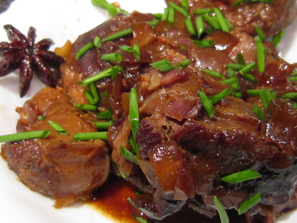 ➡ Выложить готовое мясо и овощи на плоскую тарелку и посыпать нарезанными перьями зеленого лука.