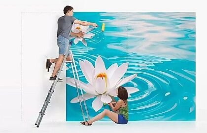 - Один человек медленно разматывает рулон фотообоев, держа его вертикально под углом к стене, другой постепенно разглаживает фотообои на стене с помощью обойного шпателя. Излишки обоев (запас) обрезаются на стене после оклеивания, используя металлический шпатель и канцелярский нож.