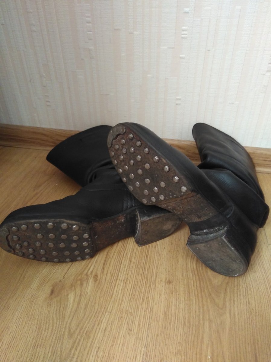 Переделанные под Вермахт яловые сапоги. Металлические комплектующие оригинал. 43 размер. Для информации:кирзовые сапоги шьются из кирзы — многослойной прочной хлопчатобумажной ткани, пропитанной раствором каучука и обработанной специальным водоотталкивающим составом. Яловые сапоги – это сапоги, изготовленные из шкуры теленка или молодой не отелившейся коровы,на фото сапоги из кожи! Вот так наша