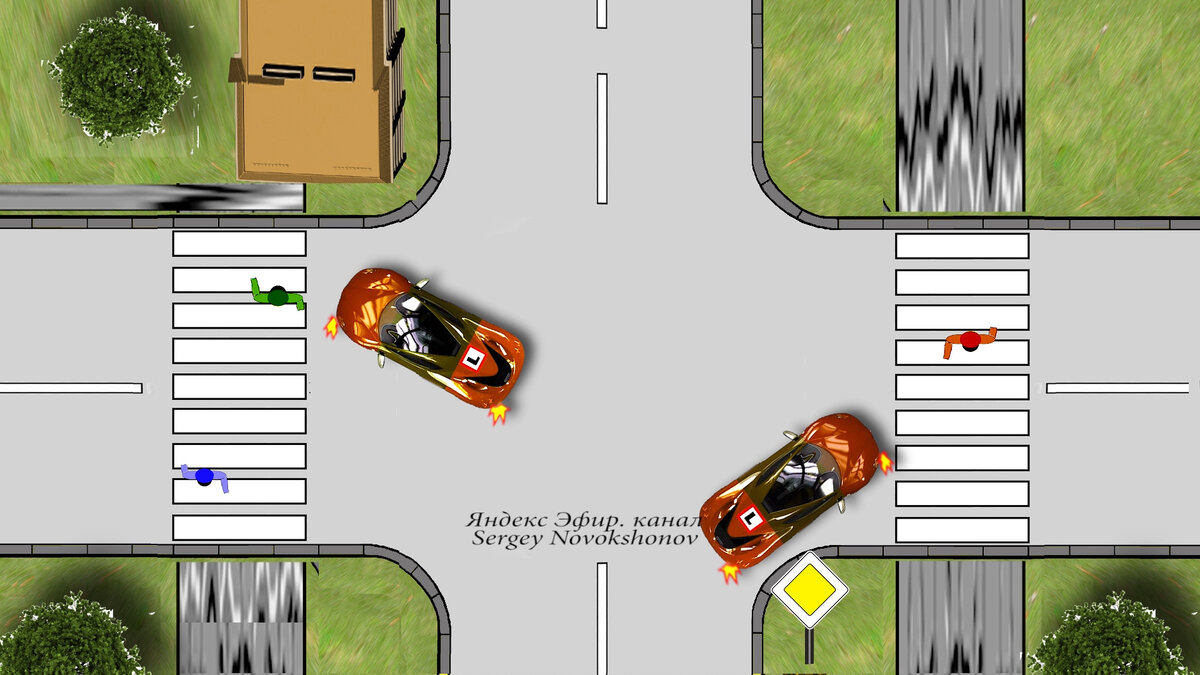 Мы определили, что мы находимся на главной дороге. Это радует, но это не всё. Нам надо определить, нет ли у нас справа такой же главной дороги. Ведь если справа была бы главная дорога и там двигался бы автомобиль, с которым мы пересекаемся, то нам необходимо его пропустить. В данном случае, справа нет главной дороги. Значит, у нас нет проблем, мы едем первые. Следом поедет коричневый автомобиль, который тоже на главной, но он у нас был не справа. Слева. Мы имели перед ним преимущество. Также, как и перед автомобилями со второстепенной дороги. Коричневый проезжает. Следом проезжает синий и зеленый. В первую очередь тот, у кого нет помехи справа.