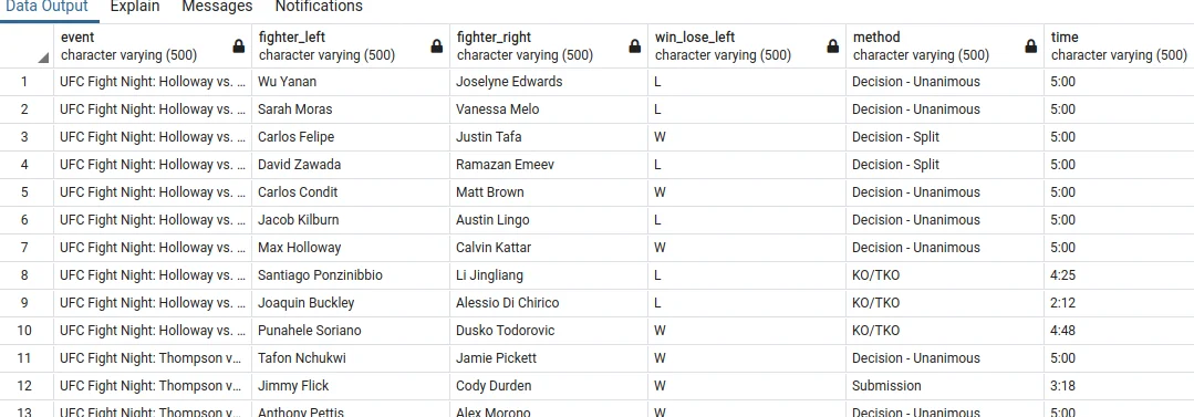 Для опытов используем таблицу статистики боев, проведенных спортивной организацией Ultimate Fighting Championship (получена скрапингом сайта ufcstats.com, о котором подробнее писал здесь):