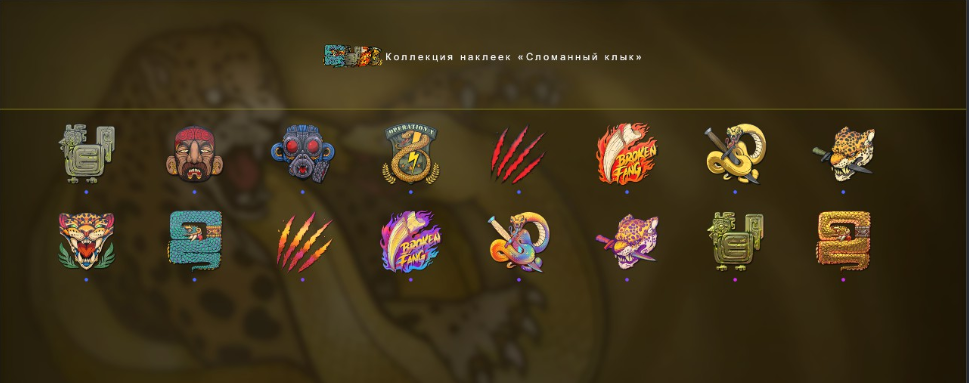 Здесь я рассмотрю только наклейки из операции сломанный клык, в которой содержится 16 наклеек: 4 голографические, 2 металлические и 10 обычный.