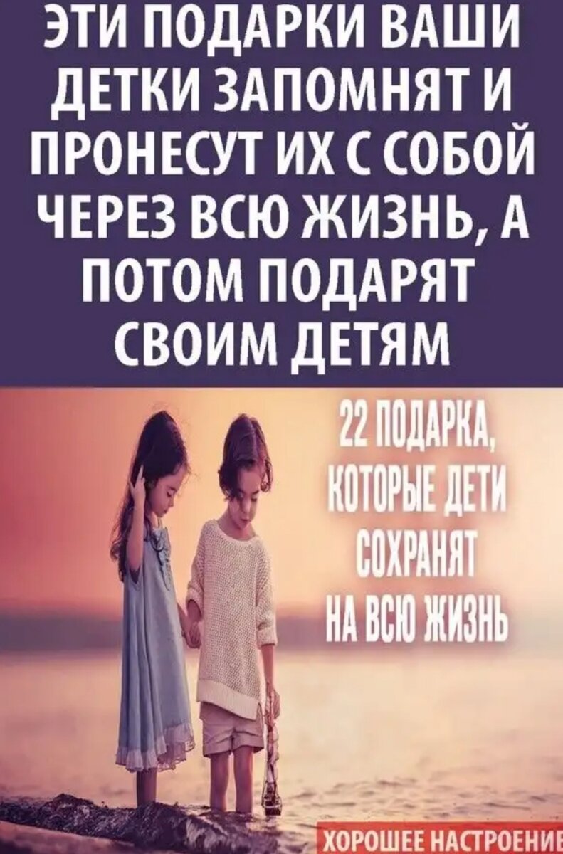 На сегодняшний день дети просто утопают в изобилии игрушек, игр, развлечений.Сейчас столько всего существует для детей, что их уже просто нереально чем-то удивить.Но эти 22 подарка они точно запомнят на всю жизнь!Более того, они пронесут их с собой через всю жизнь и скорее всего, подарят уже своим детям. 1. Вера в их силы. Ребенку чрезвычайно важно знать, что самый любимый человек в мире в них верит. Давайте ребенку понять, что вы уверены в нем, в его умениях и возможностях. Всего одно ваше слово способно сделать из малыша успешного гения. 2. Любовь во всех ее проявлениях. Обнимайте, целуйте, говорите слова любви всегда, несмотря ни на что! Даже если вашему ребенку уже за 30! 3. Семейные ужины. Эти минуты семейного единения запоминаются детьми на всю жизнь. Это прекрасная традиция, которая объединяет, мирит, вдохновляет и умиротворяет. 4. Радость. Радуйтесь жизни и своему ребенку. Не стесняйтесь своих чувств, смейтесь вместе с малышом, дурачьтесь. 5. Крепкая и полная семья. Старайтесь сохранить семью и хорошие отношения с ее членами. Для ребенка семья — это тот фундамент, та опора, которая дает поддержку и помогает идти по жизни. 6. Свое время. Это самый ценный подарок, особенно для современных детей. Находите время для ребенка каждый день! Чтобы просто побыть с ним, пообниматься, поиграть вместе, погулять или просто поваляться на кровати. 7. Внимание. Еще одна вещь, которой постоянно не хватает детям. Доброта. Ребенок еще успеет научиться жесткости и жестокости. А вы покажите ему пример настоящей доброты и умения сострадать. 8. Умение ценить. Научите ребенка ценить то, что у него есть, но всегда стремиться к большему. 9. Интерес. Интерес к миру присутствует у каждого ребенка. Храните, берегите его! Постарайтесь не убить всякими: «Не лезь, не мешай, хватит говорить, сколько можно спрашивать?». 10. Умение принимать решения. Стимулируйте к самостоятельности, помогите принимать последствия своих действий, покажите пример настоящей смелости и решительность. 11. Рамки. Детям чрезвычайно тяжело жить во вседозволенности и не иметь никаких ограничений. Им нужны рамки, которые структурируют для них этот мир. Только не увлекайтесь запретами, иначе это чревато не послушание. 12. Свобода. Помните, что запретов должно быть минимум. Давайте ребенку возможность выбирать, самостоятельно принимать решения, действовать и учиться на собственных ошибках. 13. Похвала. Детям очень важно чувствовать одобрение их действий со стороны родителей. Это стимулирует к совершенствованию. 14. Любовь к творчеству. Предоставляйте возможность творить столько, сколько хочется. Поощряйте творческую деятельность, создавайте условия для нее. Сами увлекайтесь и занимайтесь с ребенком. Это очень важное умение в эпоху Интернета и компьютерных технологий, которое учит видеть прекрасное во всем, радоваться жизни, находить выходы из нестандартных ситуаций. 15. Щедрость. Покажите на личном примере, что такое щедрость, как делиться, и научите получать удовольствие от собственной щедрости. 16. Духовность. Прививайте детям осознание наличия души. Хорошо, если они научатся действовать, руководствуясь потребностями не только своего тела, но и души. 17. Правда. Будьте честными с детьми. Таким образом вы научите их быть честными. Кроме того, вы продемонстрируете им, что вам можно доверять, что с вами они в безо